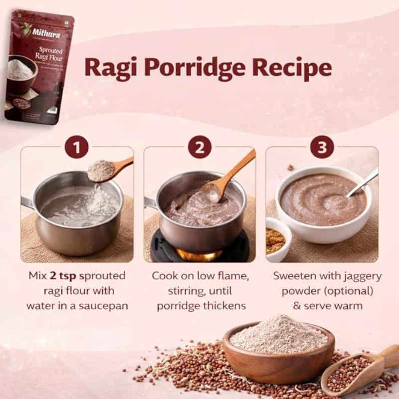 Made from 100% naturally sprouted Ragi (Finger Millet), a rich source of calcium, iron, and fiber.Sprouted in traditional way to make it lighter, more nutritious, and easier to digest - especially for babies, toddlers, and growing children.